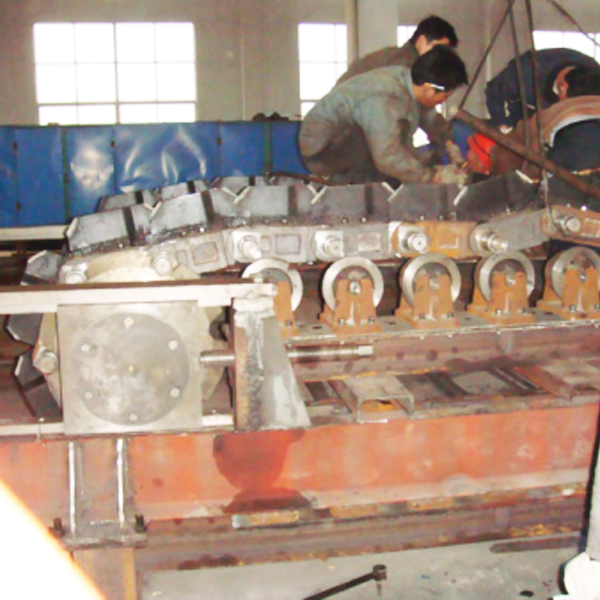 4.链板装置:链板装置是由链轨、槽板、及螺栓等部件组成。主要作用是运载物料。链板为单元弧搭接形式,采用低合金钢板焊接而成,强度高,耐磨损,不漏料。链轨为大批量生产的简易链轨。链轨与链板为螺栓连接,其特点是结构误差小,运动平稳,强度高,拉力大,无需润滑。