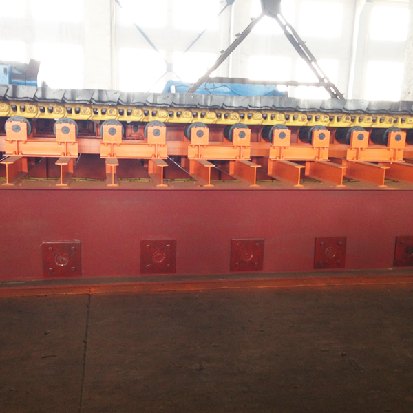 (5)机架:机架为整体机架,由头架、中间架、尾架组成,均为槽钢、角钢及钢板焊接而成,机架上设有四条轨道支承链板装置及物料(上分支)及两条轨道支承链板装置(下分支)。